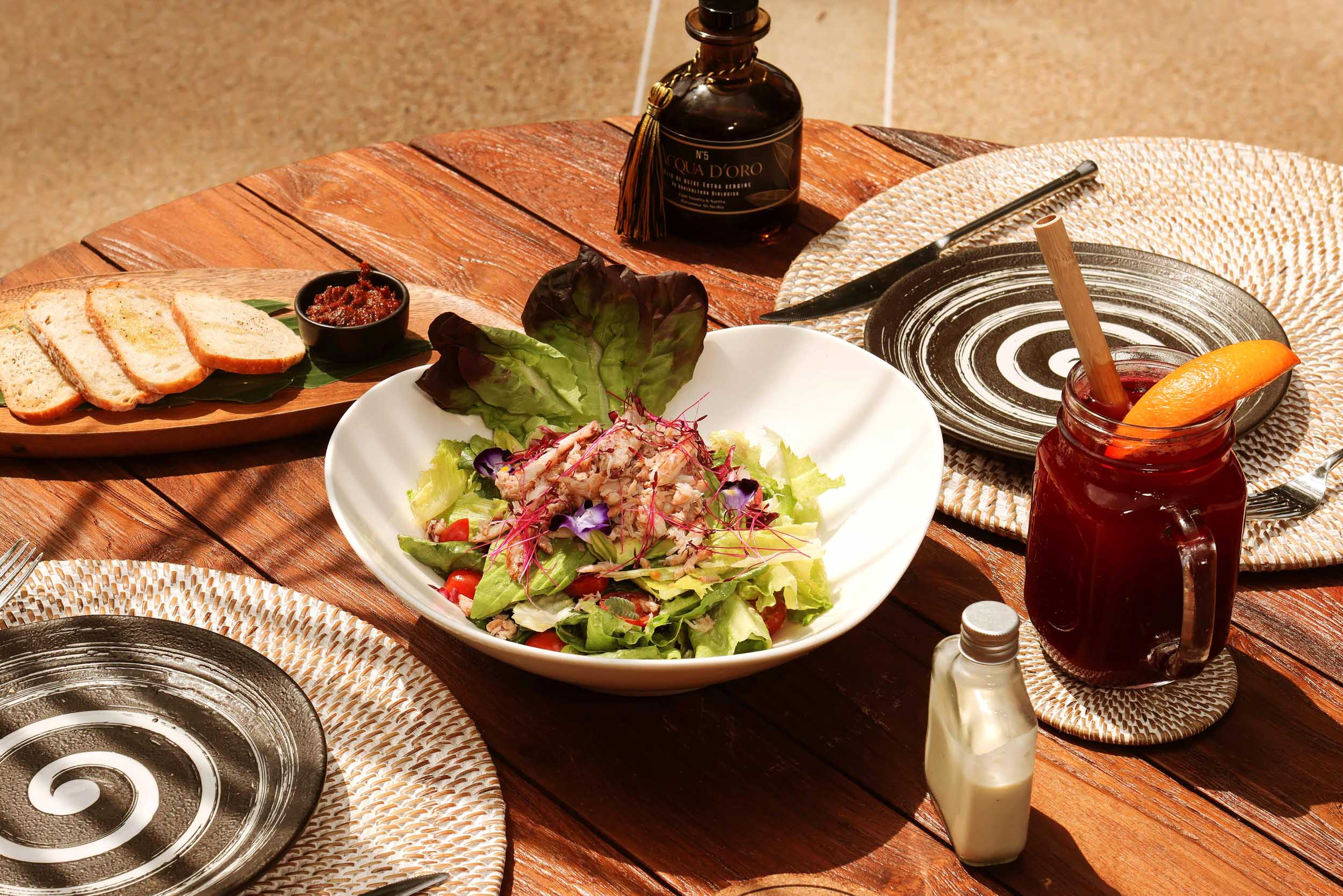 สลัดผักกาดหอม แซลมอนเกรฟแล็กซ์ กุ้ง อะโวคาโด ทับทิม ขนมปังปิ้งแซลมอนคาเวียร์